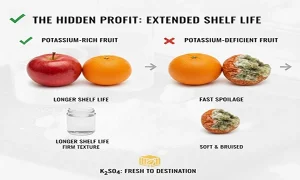 میوههایی که با پتاسیم کافی تغذیه شدهاند، بافت سفتتری دارند و آب خود را دیرتر از دست میدهند. این ویژگی باعث میشود محصول در انبار یا سردخانه دیرتر دچار چروکیدگی و فساد قارچی شود. برای صادرکنندگان، سولوپتاس یک ضرورت اجتنابناپذیر است.